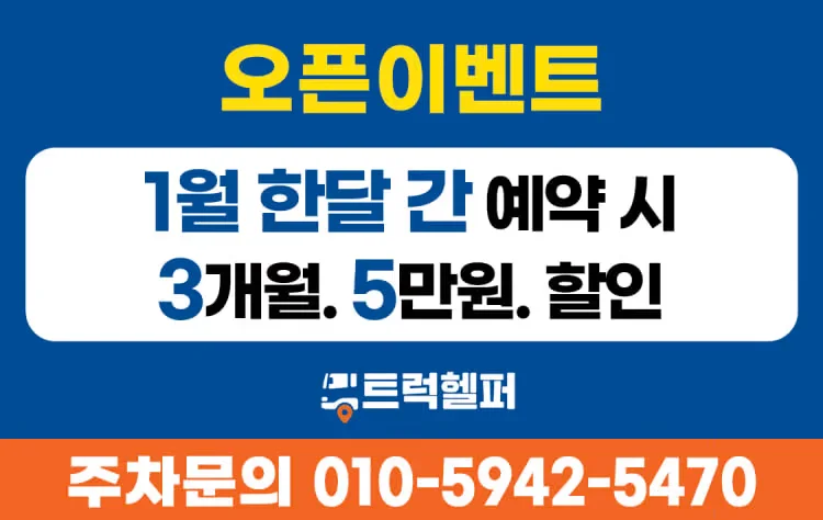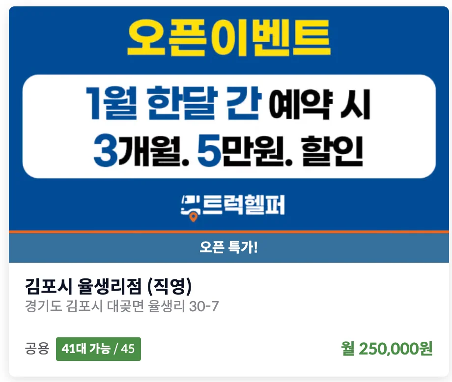 김포 지역에는 현재 트럭헬퍼 대곶면 율생리점이 운영되고 있습니다. 신규 오픈으로 여유 공간이 충분하며 오픈 기념 특별 할인 혜택도 제공하고 있습니다.