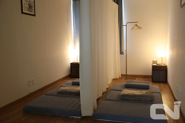 각 수면실에는 침대, 이불, 베개가 다 있습니다. 개별 조명도 있고 옷걸이도 있습니다. 신발은 입구에 벗어두고, 커튼 닫으면 완전 프라이빗 공간입니다.